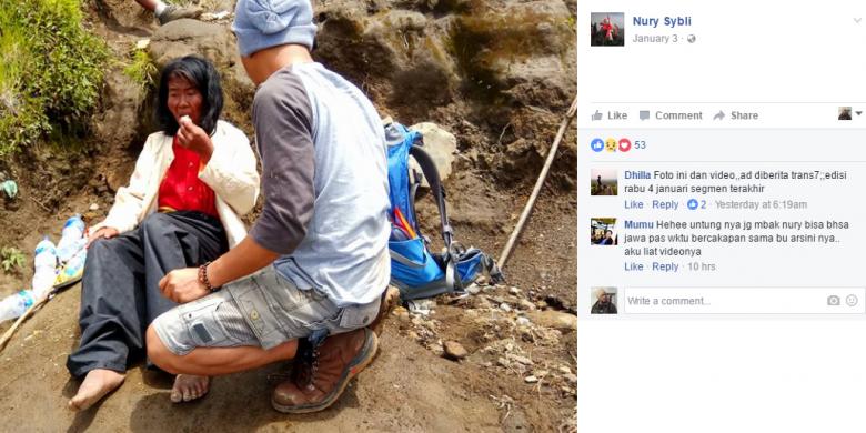 Dalam akun tersebut, Nury menceritakan bahwa ia bersama pacar dan temannya menemukan Ibu Arsini dalam kondisi mengkhawatirkan saat mendaki Gunung Ciremai.