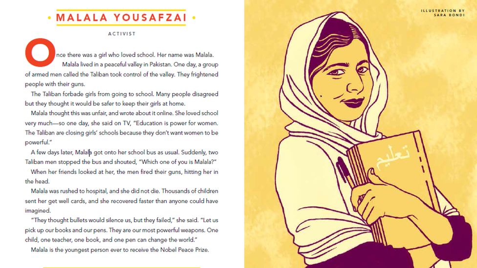 Begitulah awal kisah nyata Malala Yousafzai, remaja Pakistan pemenang Nobel yang ditembak Taliban tahun 2012. Kisah Malala dipaparkan dalam buku yang baru saja diterbitkan dengan judul Good Night Stories for Rebel Girls: Dongeng Pengantar Tidur bagi Para Gadis Pemberontak.